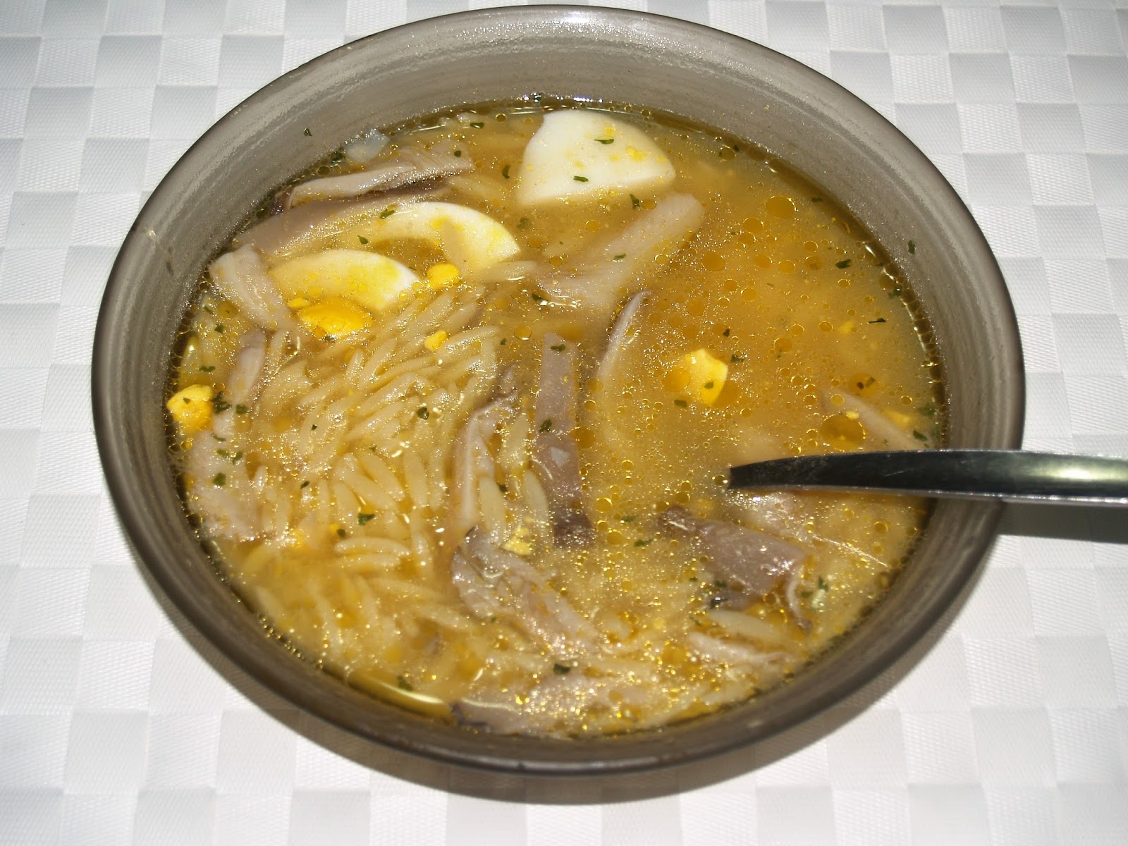 É muito simples de fazer! Basta cortar alho às rodelas e deixar a dourar com um pouco de azeite numa panela. Depois, acrescenta-se os cogumelos cortados em tiras. Estes devem ser da espécie Pleurotus tendo em conta a sua textura semelhante à do frango. Encontram-se facilmente em qualquer supermercado. Quando os cogumelos estiverem também dourados, junta-se água até encher a panela a 3/4 e deixa-se levantar fervura. Nesse momento, junta-se as massas (eu usei bagas/pevides, mas é válido qualquer tipo de massa). Finalmente, junta-se um pouco de sal, pimenta branca, salsa, alecrim e pimentão doce moído. Eu acrescentei ainda 2 ovos caseiros cozidos, mas esta parte é opcional. Deliciem-se com as fotos e experimentem a receita!